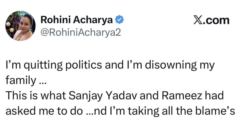 इसी तनावपूर्ण माहौल के बीच रोहिणी आचार्य ने सोशल मीडिया पर लिखा—